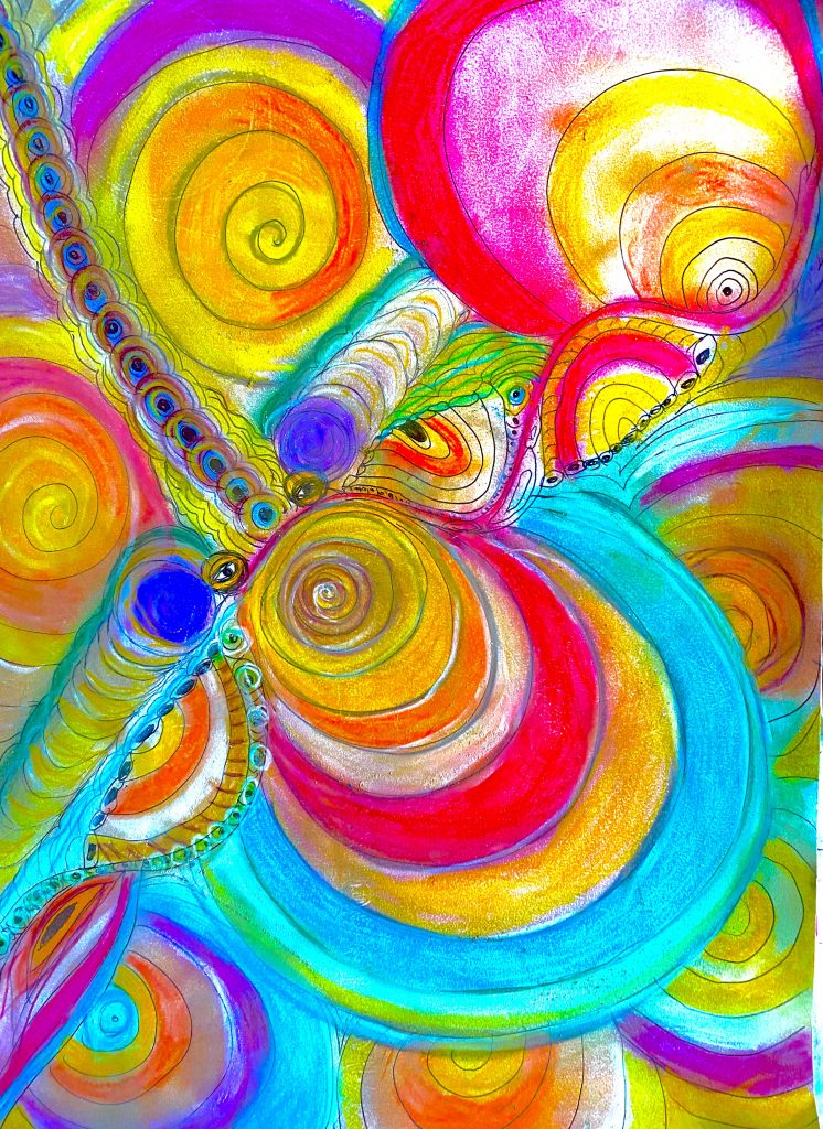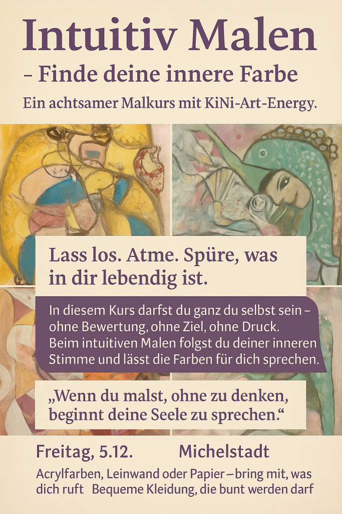 Intuitive Kunst ist eine besonders kreative Ausdrucksform, bei der nicht geplant oder kontrolliert wird, sondern ganz spontan und aus dem Bauch heraus gearbeitet wird. Im Mittelpunkt steht das Vertrauen in die eigenen Gefühle, Impulse und inneren Stimmen – einfach zu beginnen, ohne sich Gedanken über das Ergebnis zu machen. Viele Menschen erleben durch diese Kunstform eine tiefgehende Verbindung zu sich selbst, da sie sich frei und ohne Bewertung oder Selbstkritik ausdrücken können. Intuitive Kunst zeigt eindrucksvoll, dass es nicht um Perfektion oder technische Fertigkeiten geht, sondern um den kreativen Prozess, das Entdecken neuer Ausdrucksformen und das bewusste Erleben im Hier und Jetzt. So kann jeder, unabhängig von Können, Erfahrung oder künstlerischem Hintergrund, auf Augenhöhe mit seiner eigenen Kreativität in Berührung kommen und sie wertschätzen.