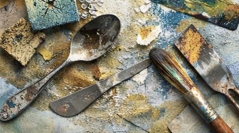 Manchmal sind es Folien, Papier oder Verpackungsmaterial. Manchmal Naturmaterialien, die ruhe und Erdung bringen. Manchmal auch einfach meine Hände, ein Löffel, ein Stück Schwamm oder eine alte karte, alte Briefe. Alles darf man verwenden.